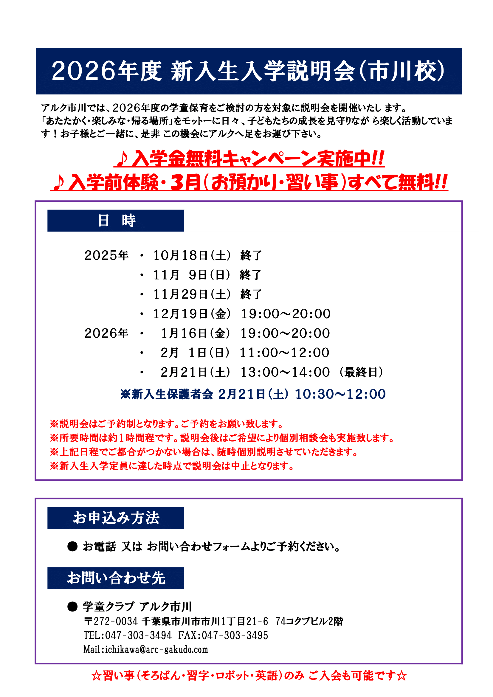 ♪入学前体験・3月(お預かり・習い事)すべて無料!!